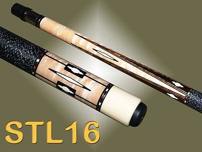 Schon STL16 has a Birdseye Maple forearm with 4 Ebony points inlaid with colored veneers and white designs. The butt sleeve is birdseye Maple with window design in Ebony and white designs. Completing the cue is a black and white Irish linen wrap and custom rings. Please Note - Stains Color, Inlay Material, and butt cap color may be different than that show. Schon Cues policy is to use a variety of different stains, inlays materials, and butt colors to help ensure the uniqueness of each cue. The actual cue design will remain the same.